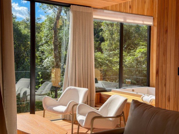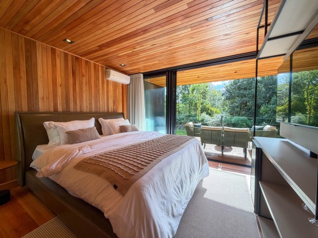 Máquina de café expresso, chás e roupões de algodão 400 fios completam a experiência de acolhimento nesta divindade das montanhas.