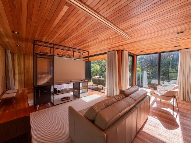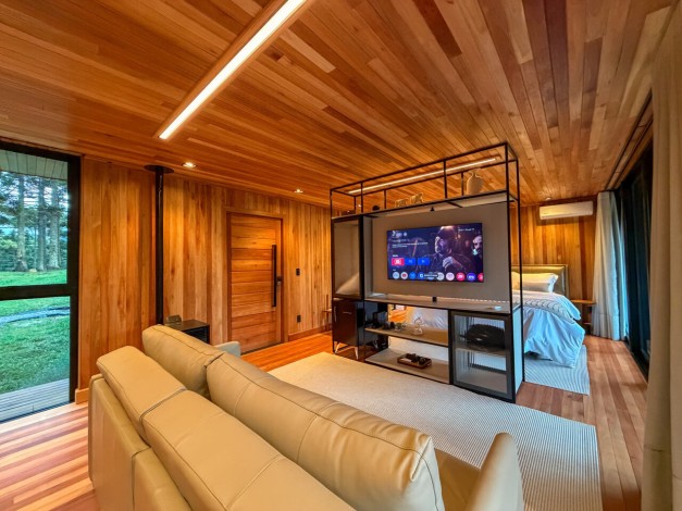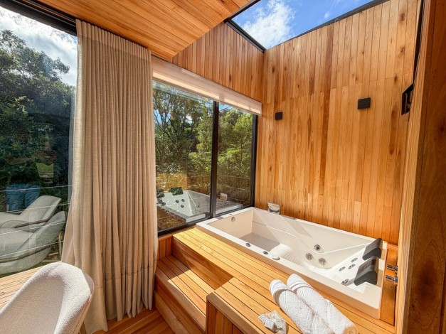 Um convite ao relaxamento profundo através do SPA interno com vista para o horizonte, honrando o elemento água que dá nome à cabana.