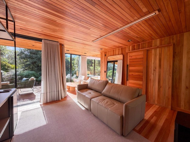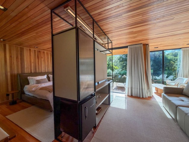 Um convite ao relaxamento profundo através do SPA interno com vista para o horizonte, honrando o elemento água que dá nome à cabana.