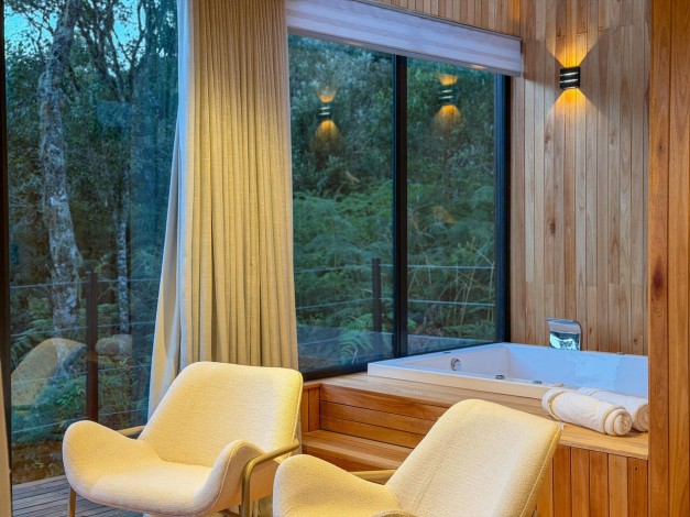 Máquina de café expresso, chás e roupões de algodão 400 fios completam a experiência de acolhimento nesta divindade das montanhas.